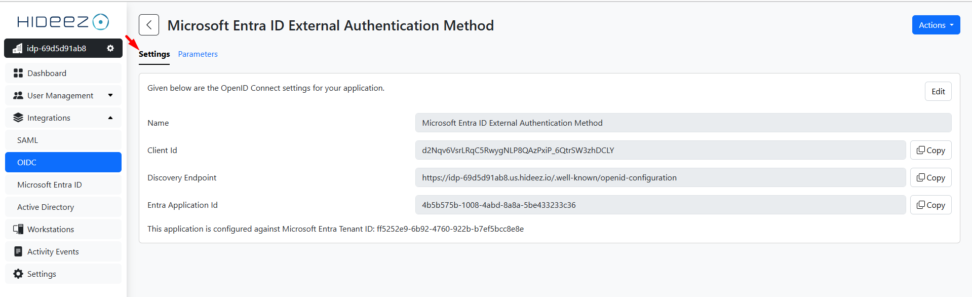 Keep the tab Settings with values Client ID, Discovery Endpoint, and Entra Application ID ready for the next step.