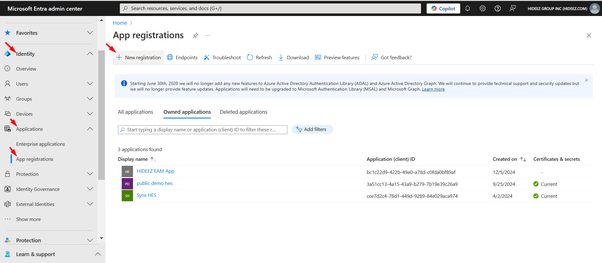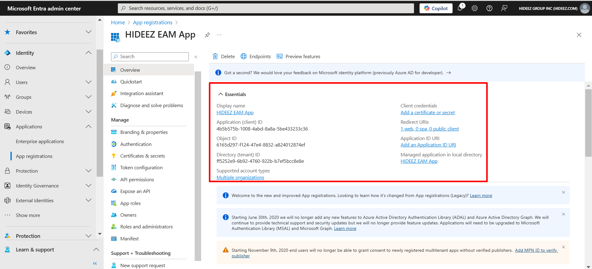 After registering, keep the Application ID from the Essentials section. You'll need it later to configure your EAM in Hideez Cloud.