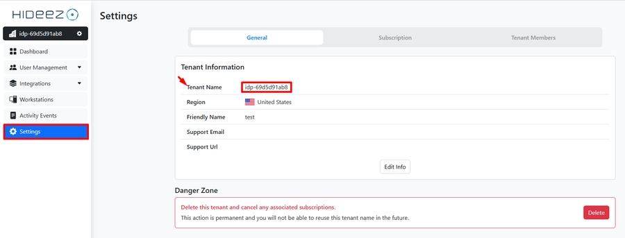 You can find the Tenant Name in the Hideez Identity Cloud in the Settings section: