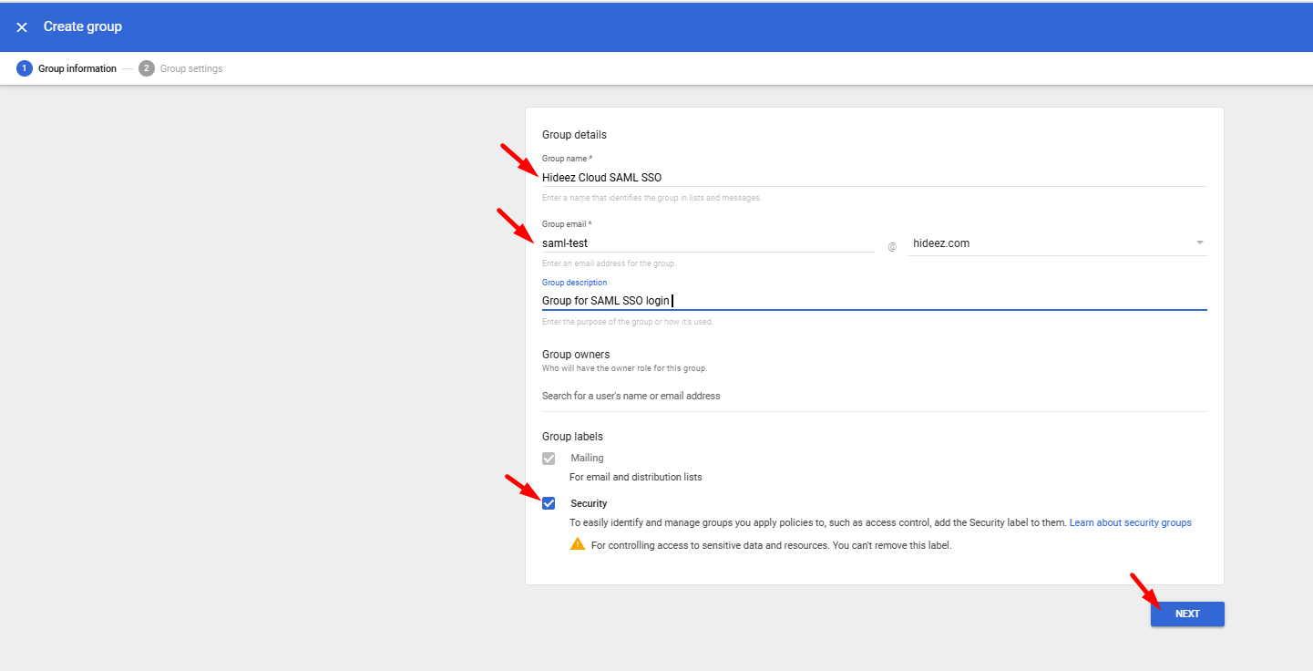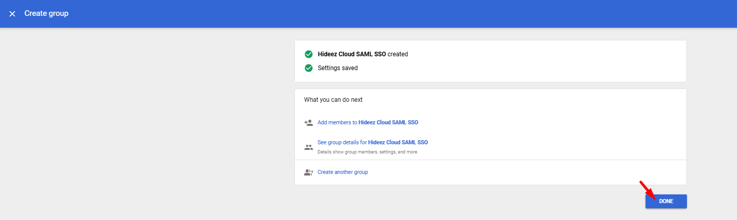 Choose an existing option or create a new group, user, or OU for SAML login via Hideez Cloud.