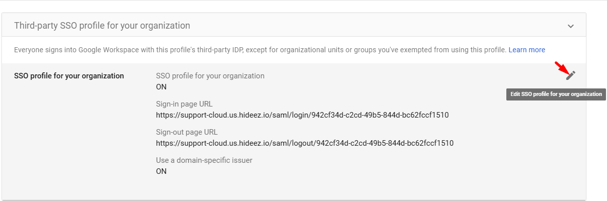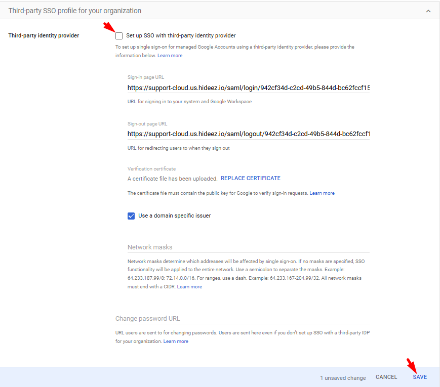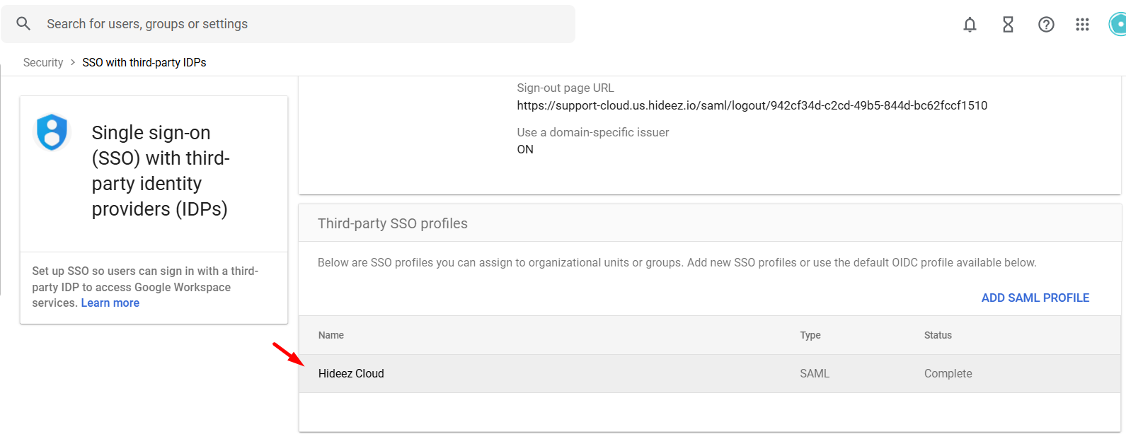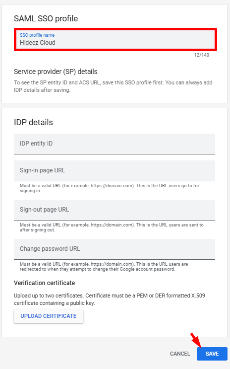 In Google Admin, open the SAML profile and fill in IDP details from Hideez Cloud: