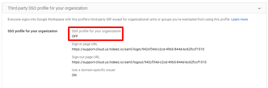 Root Organization SSO Profile: Uncheck Set up SSO with third-party identity provider in Google Admin Console and save.