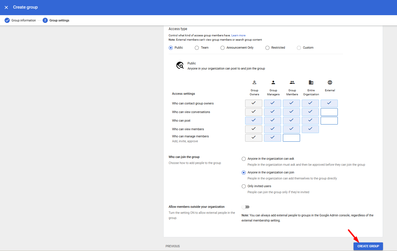Select Group labels → Security, and proceed to configure Access type (e.g., Public), then click Create Group.