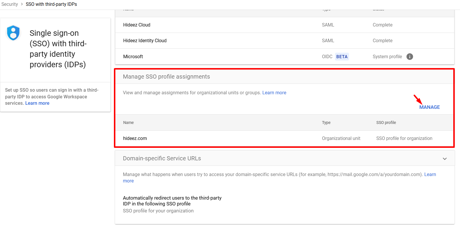 Multi-IDP SSO Profile: Go to Manage SSO profile assignments → select None for SSO profile and save.