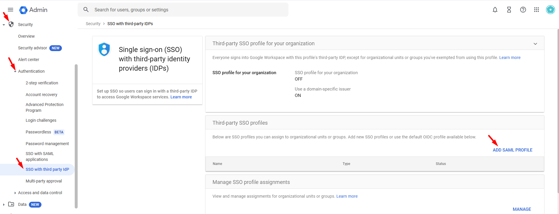 Under Third-party SSO profiles, click Add SAML profile.