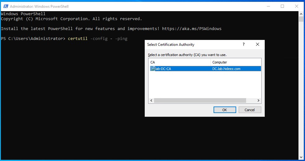certutil -config - -ping