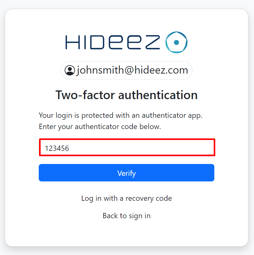 Test Login to the Application with MFA Verify that the user can successfully log in to the application with MFA using the Hideez Authenticator app for the secomd factor: